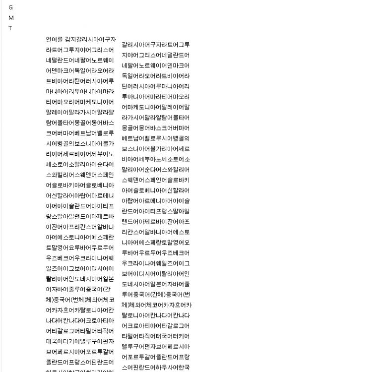 언어를 감지갈리시아어구자라트어그루지야어그리스어네덜란드어네팔어노르웨이어덴마크어독일어라오어라트비아어라틴어러시아어루마니아어리투아니아어마라티어마오리어마케도니아어말레이어말라가시어말라얄람어몰타어몽골어몽어바스크어버마어베트남어벨로루시어벵골의보스니아어불가리아어세르비아어세부아노세소토어소말리아어순다어스와힐리어스웨덴어스페인어슬로바키아어슬로베니아어신할라어아랍어아르메니아어아이슬란드어아이티프랑스말아일랜드어아제르바이잔어아프리칸스어알바니아어에스토니아어에스페란토말영어요루바어우르두어우즈베크어우크라이나어웨일즈어이그보어이디시어이탈리아어인도네시아어일본어자바어줄루어중국어(간체)중국어(번체)체와어체코어카자흐어카탈로니아어칸나다어칸나다어크로아티아어타갈로그어타밀어타직어태국어터키어텔루구어펀자브어페르시아어포르투갈어폴란드어프랑스어핀란드어하우사어한국어헝가리어히브리어힌디어