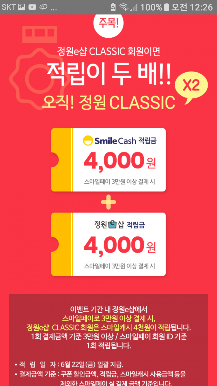 5월달에 한 정원이샵 4만원이상 스마일페이 결제한거 적립금 2배 다들 들어왔나요?
