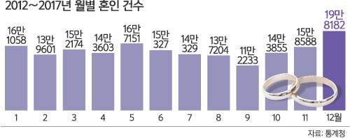 6. 결혼식 가장 많은 달 5월? → 의외로 12월 결혼이 가장 많다. 2012년~2017년 통계를 보면 12월 19만 8000여건으로 2위인 5월 16만 7천여건 보다 20% 가까이 많아.(세계)
