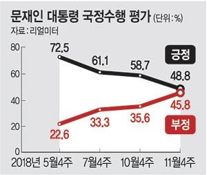 5. 文지지율 48.8% → 취임 후 최저. 50% 이하는 처음. 6개월 새 78% → 48.8%... 리얼미터 지난주 조사. 정당 지지도도 민주 37%, 22개월만에 최저 한국 26%, 2년來 최고...(문화 외)▼