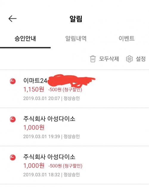 헉. 이글 보고 알림 확인해보니 500원 청구 할인 안된게 되게 많네요ㅡㅡgs25 이용한건데.. | ||