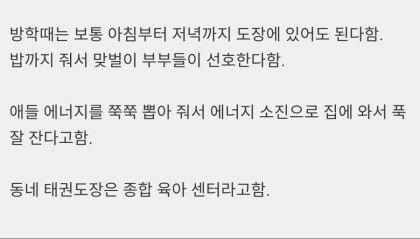 태권도 다니는 애들이 자신감이 넘치고 활동량도 좋아보이긴 하더군요 |