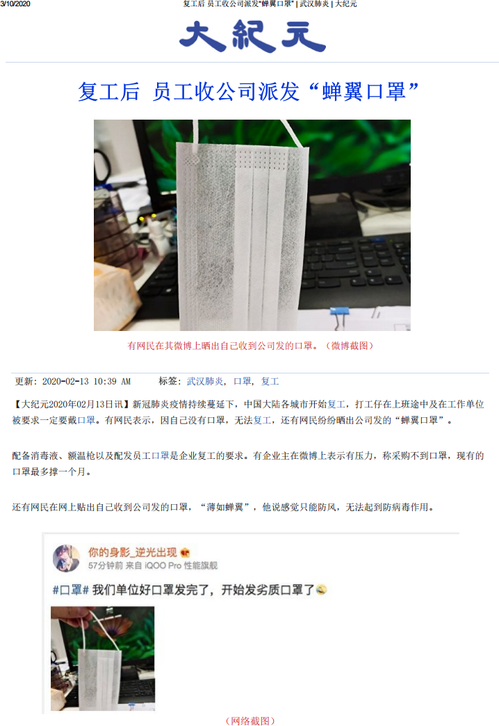 어떤 네티즌은 마스크가 없기 때문에 다시 일을 할 수 없다고 했고,