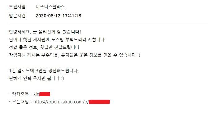 위 쪽지는 바로 운영진께 신고처리 하겠으니 혹시 위와 같은 비지니스 하시는분들은 공지 위반하지 마시길 바랍니다.