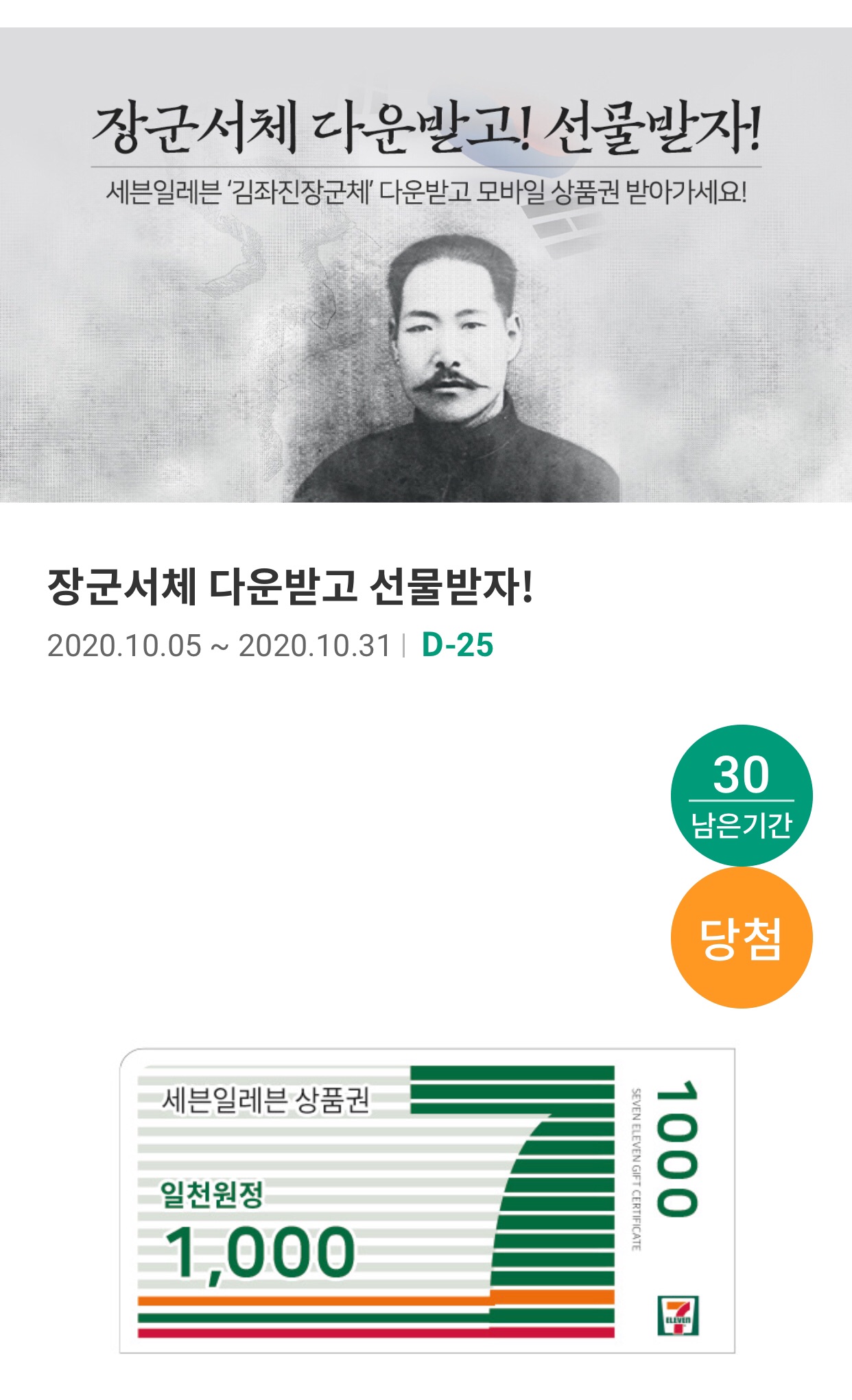 (종료)세븐일레븐앱 장군서체 다운받고 상품권 받으세요