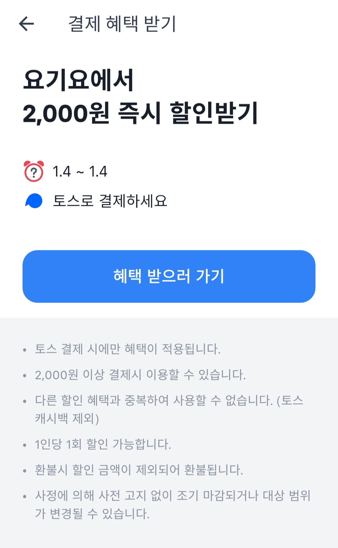 그냥 요기요에서 2천원 결제할때 토스로 하면 자동으로 할인이 되나보군요..
