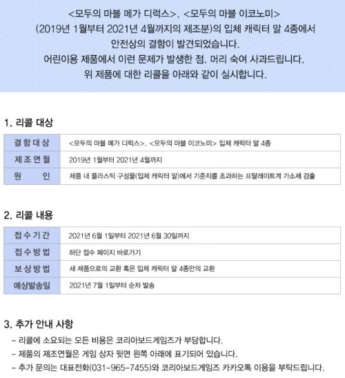 코리아게임즈에 다른 문제로 들어갔다가 리콜 공지가 있어서 알려드립니다.