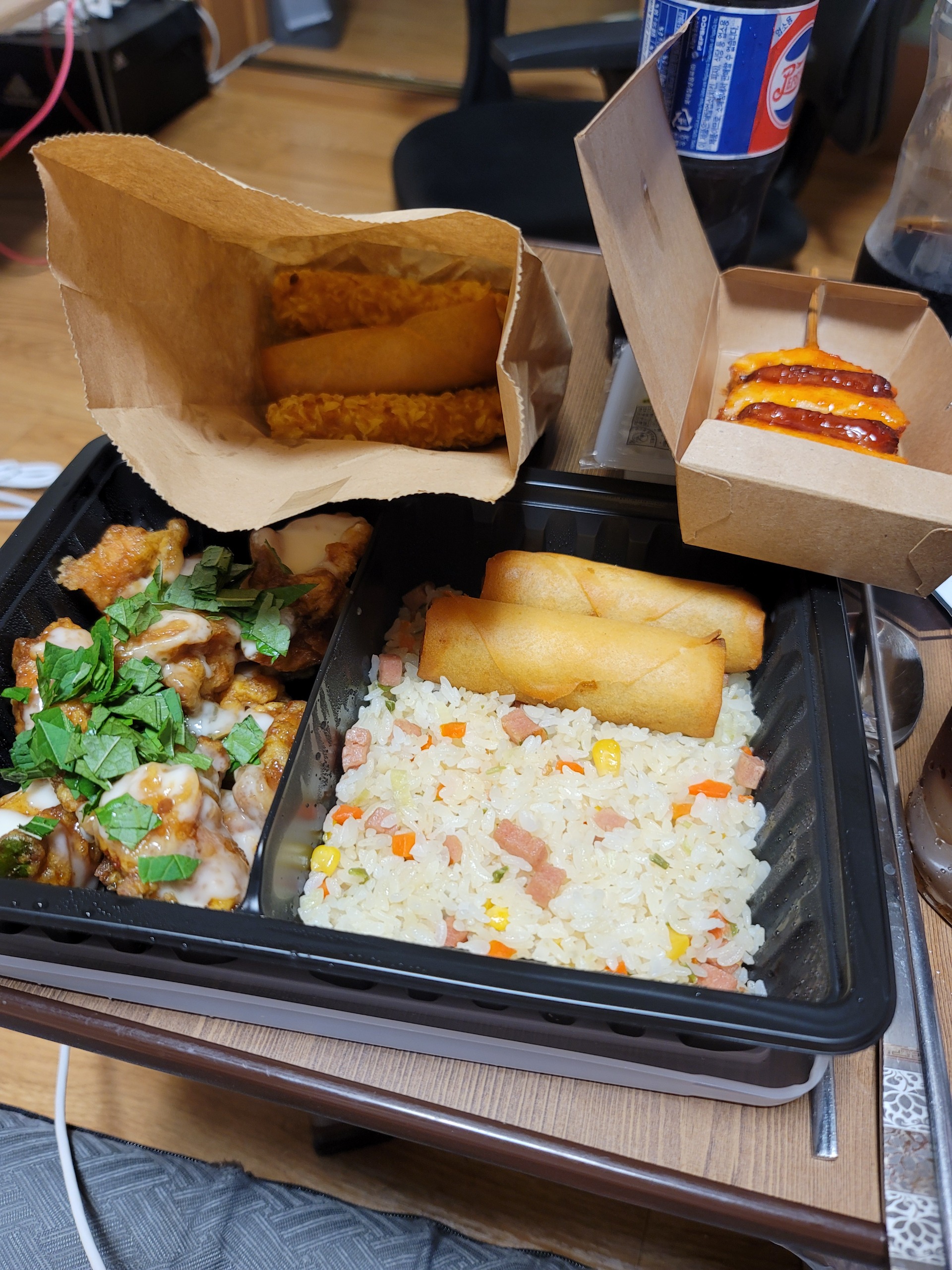 지난번과 마찬가지로 몸이 찌뿌둥한 상태로 일어나니 점심하기가 귀찮아서 배민에서 1인세트(순살치킨 + 햄야채볶음밥에 소떡 1꼬치)를 시키고 40분이 지나 제품이 도착했네요.