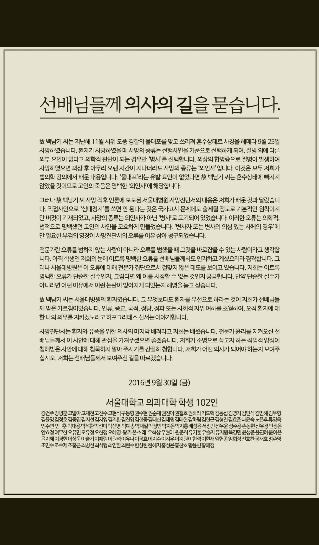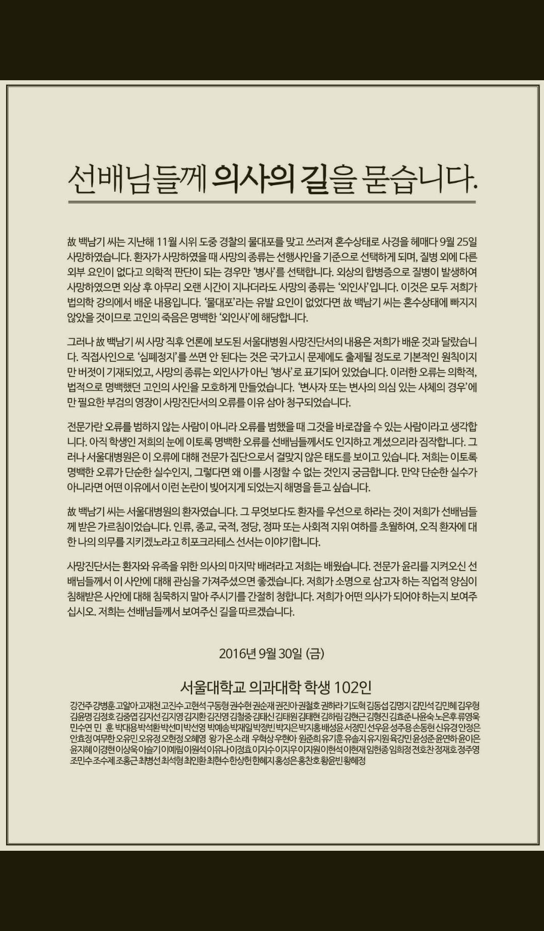 선배들의 심기를 가급적 거스르지 않게 부드럽게 돌려 표현함과 동시에 의사로서의 도리를 되짚어 보게 만드는 좋은 글이라고 생각합니다ㅎㅎ |
