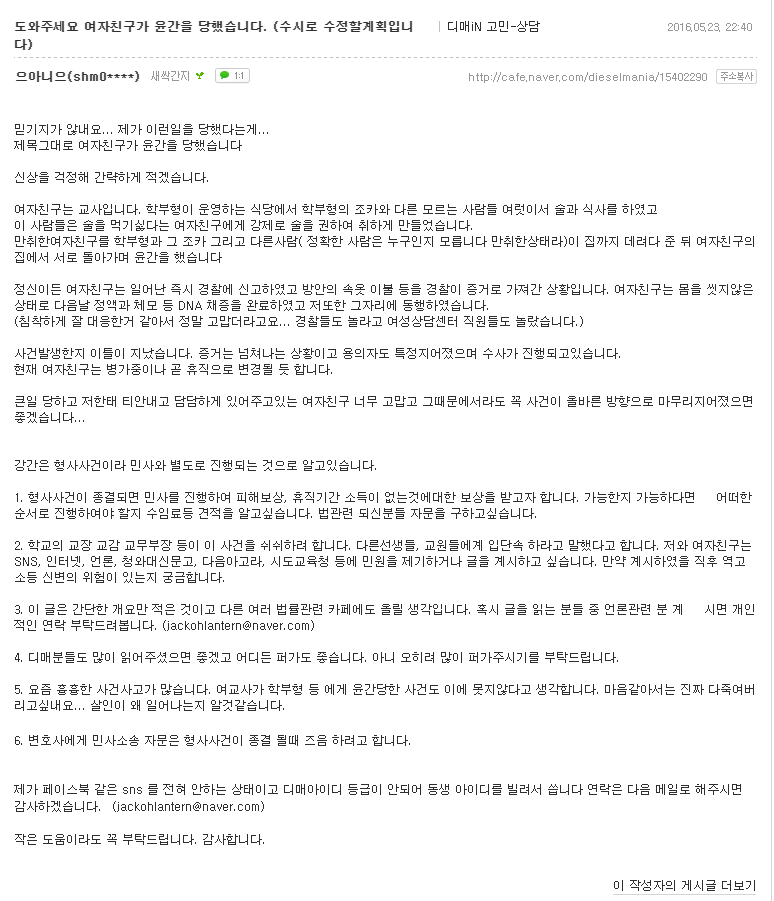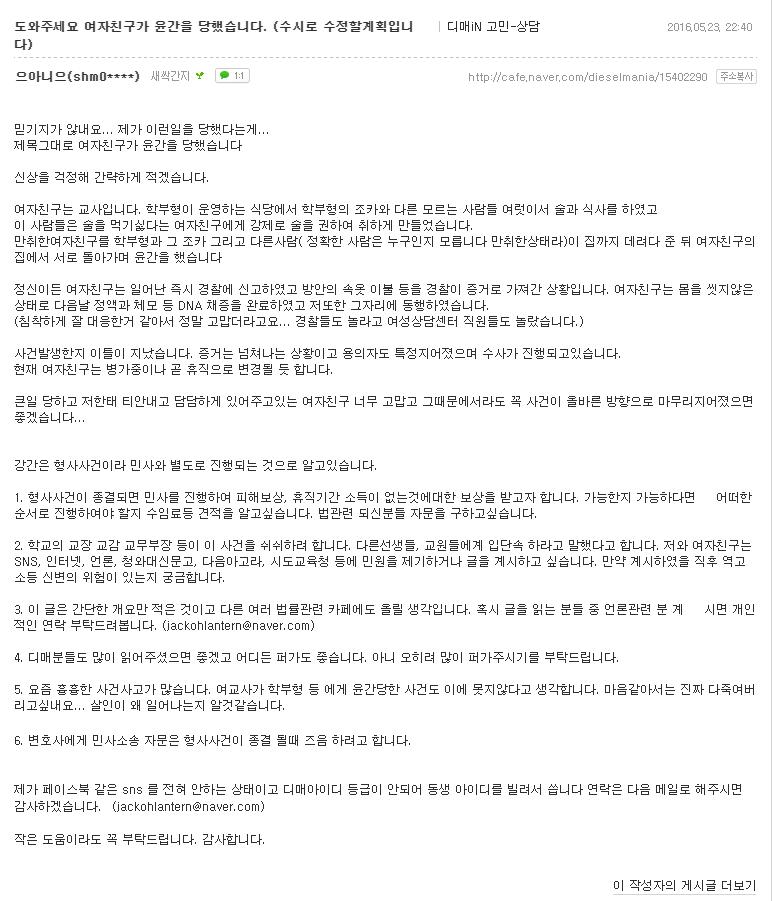 진짜 갈아마셔도 시원찮을 사람들입니다. 정액도 검출됐는데 혐의부인이라니..잘 대처하시긴 하셨지만 가슴에 남을 상처를 생각하면ㅠ |