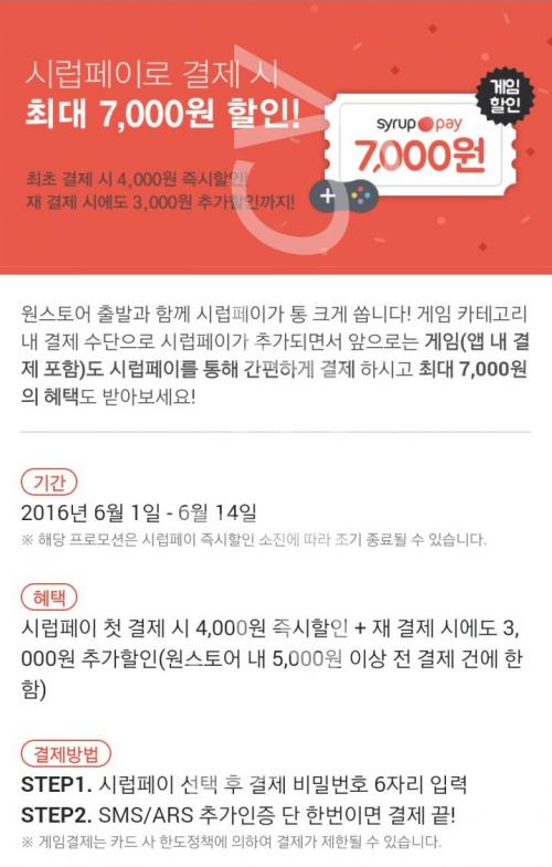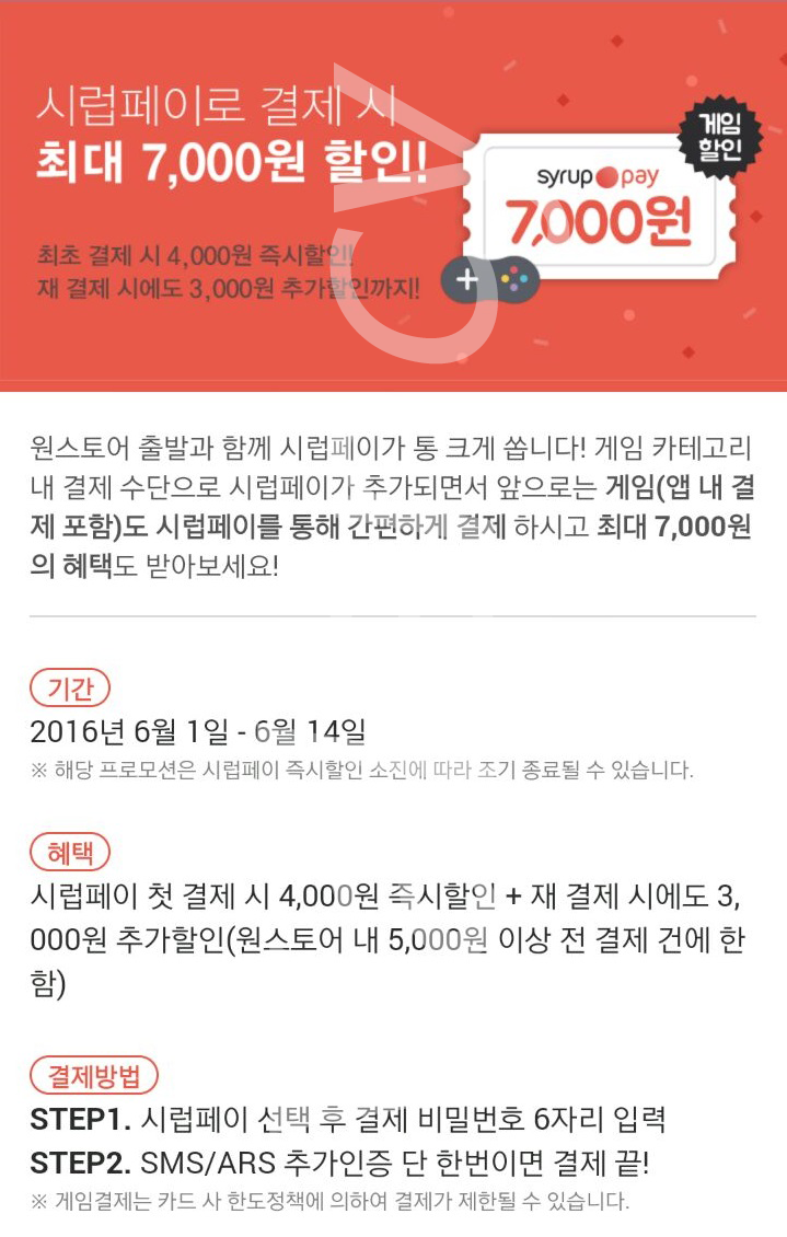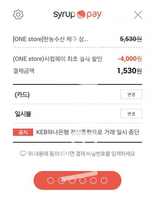 시럽페이로 5천원 이상 가맹점 첫 결제시 첫 번째 결제는 4천원, 두 번째 결제시 3천원 할인 행사를 하고 있습니다.