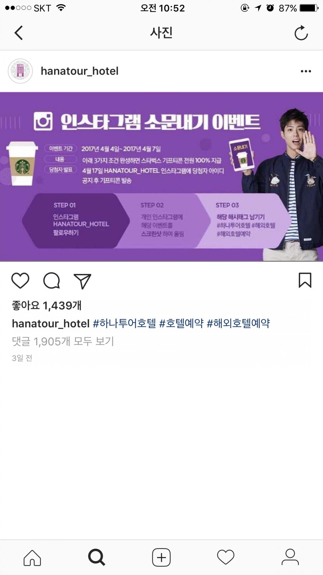 인스타앱을깔고 가입하시고 검색창에서 hanatourhotel을 치셔서 뜨는 계정 들어가셔서 팔로우하시고 저 해당 글을 찾아서 캡쳐하신후 본인 인스타에 가셔서 사진과 해시태그 3개 올리시면 자동 완료 되는것 같아요!