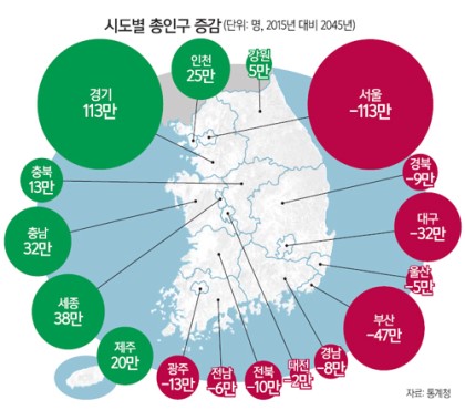 10. 2045년 인구 → 17개 시도 중 경기, 세종, 충남, 인천,제주, 충북, 강원 등 7개는 인구는 늘고, 서울, 부산 등 10개는 인구는 줄어들 것으로 전망. 통계청 추계.(세계)▼