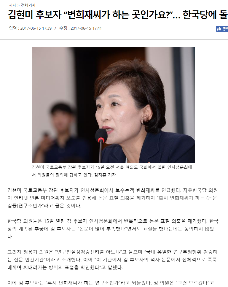 "한국당 의원들이 이번 인사청문회에서 주로 인용한 언론은 변희재씨가 창간하고 현재 대표고문을 맡고 있는 미디어워치다."