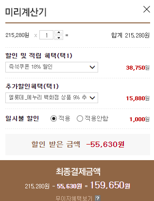 팝업창에서 할인쿠폰 클릭하시고, 예상 금액 확인해 보시면~