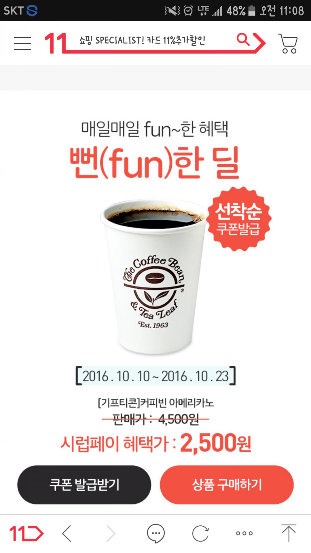시럽페이 커피빈 뻔한딜 11시에 열리는데요