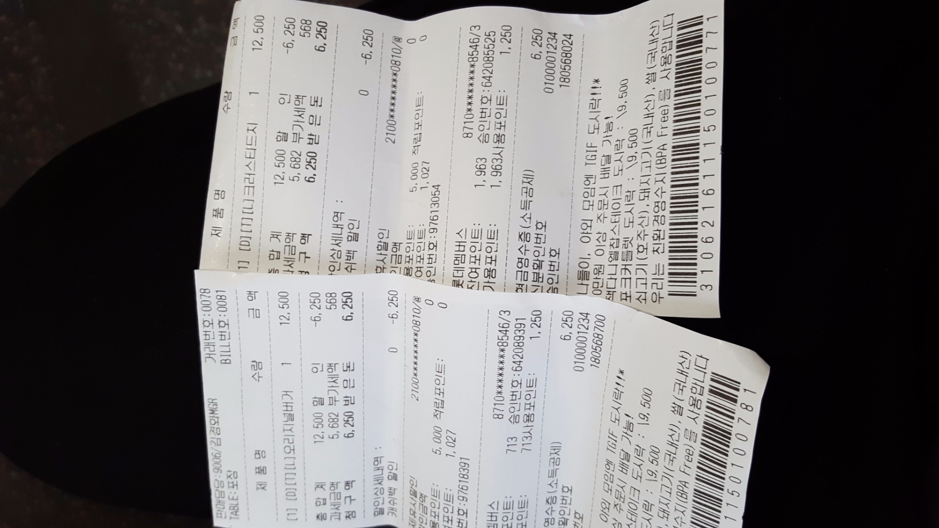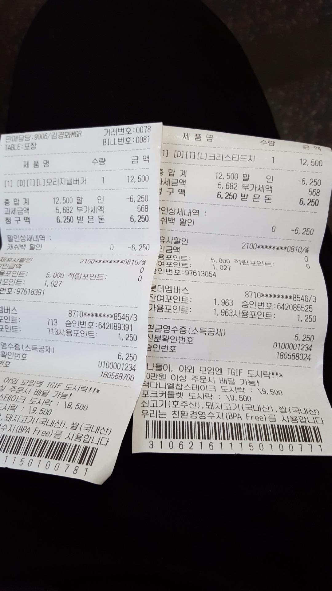 영수증 2개로 나눠서 포장해왔어요