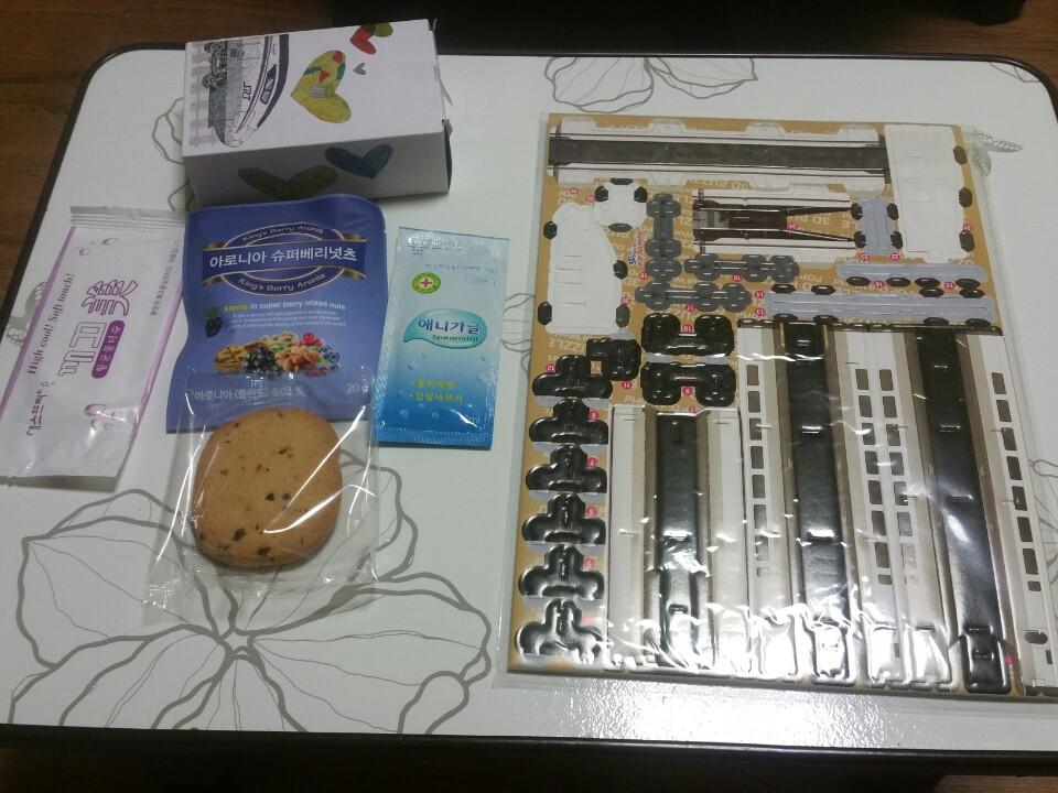 특실 용품인 과자세트와 특실에만 있는 항공기식 선반입니다 옆에 조립은 기념품으로 받았습니다