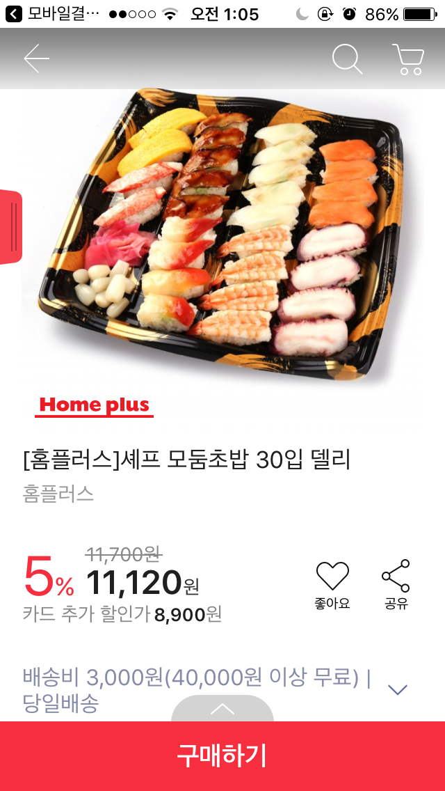 홈플초밥 낱개로도 골라서 주문되죠 치킨도되고 |