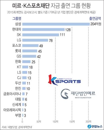 1. 그룹별 미르, K 스포츠 재단 출연액 → 삼성 204억, 현대차 128억, SK 111억, LG 78, 포스코 48억...(한경) ▼표