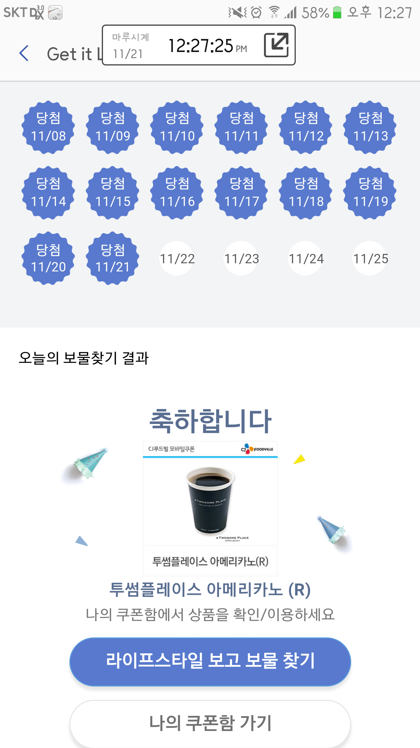 6시가 짱 입니다. 저도 오늘 6시 알람해서 커피 당첨 되었죠.. 제발 투썸만 ㅜㅜ 다른건 다 필요없네요.. | ||