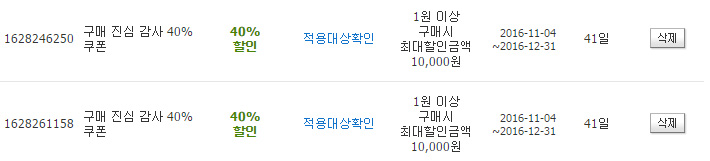 예전에 오랜만에 접속하면 50%쿠폰줬는데 그걸로 뭐 사면 진짜 감사 쿠폰 40%짤 3개 줬어요. 이거 적용범위가 넓어서 배달에도 먹힙니다. 기간도 길고 엄청 좋은 쿠폰이에요. |