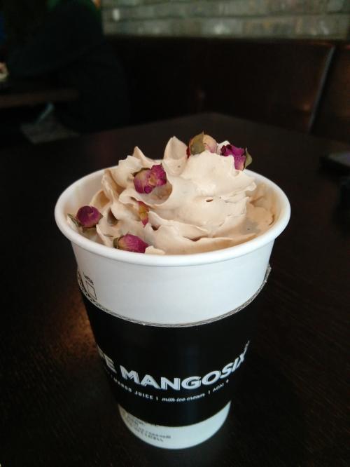 시럽테이블에서 산 기라델리 로제 초콜릿 마시러 망고식스 왔어요. 유리컵이 아닌 일회용컵이라 좀 아쉽지만 식용장미로 장식된 비주얼이 참 예쁘네요^^ 하지만 맛은 그냥 핫초코맛ㅋㅋ
