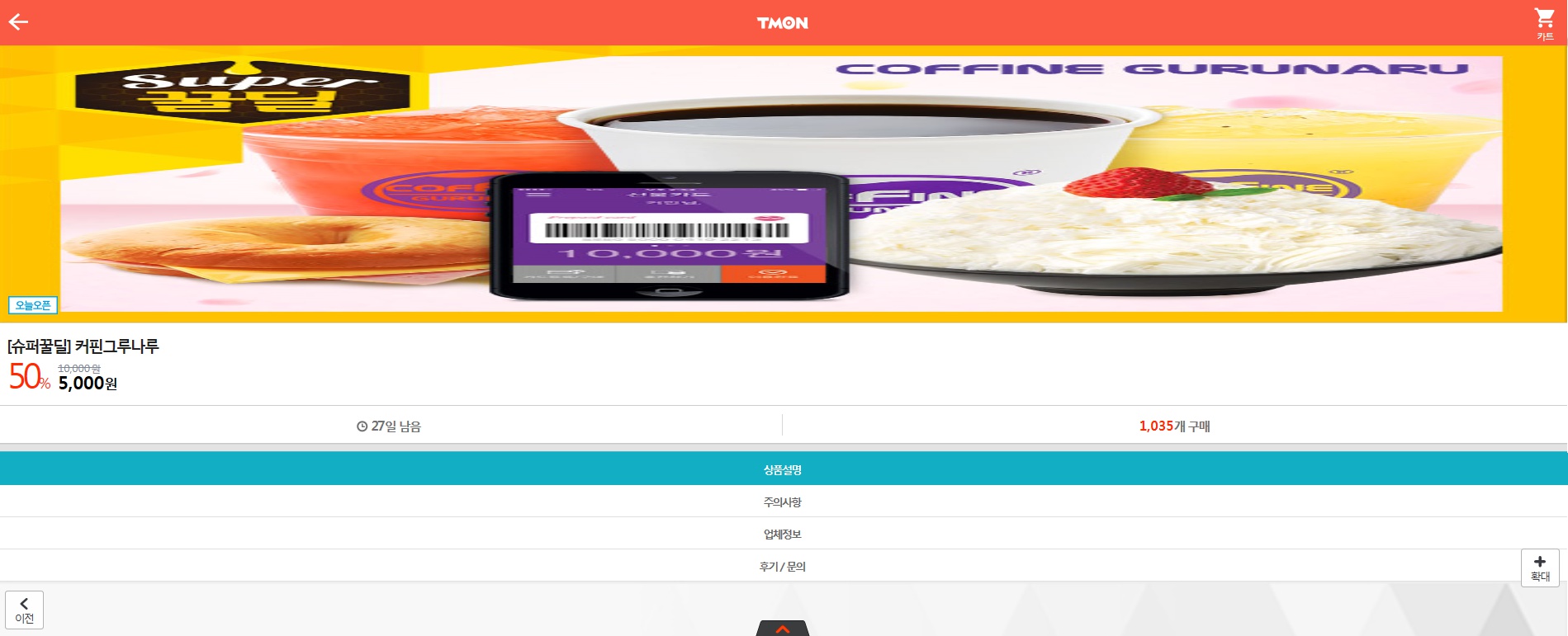 티몬 모바일에서 1만원권을 5,000원에 살 수 있습니다.