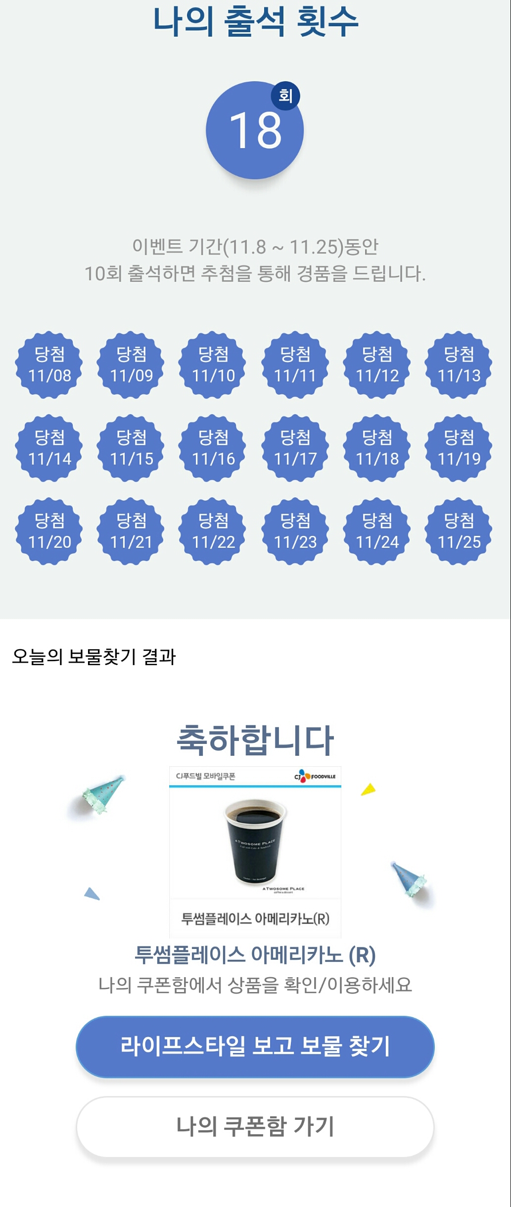 가족 휴대폰으로 한 것까지 합치면 총 투썸 43개, 와퍼주니어 1개, 외식할인권 1개, 빼빼로 2개 얻었네요.