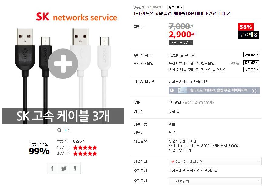 SK 모캣 고속 5핀 케이블 1m 3개 2900원