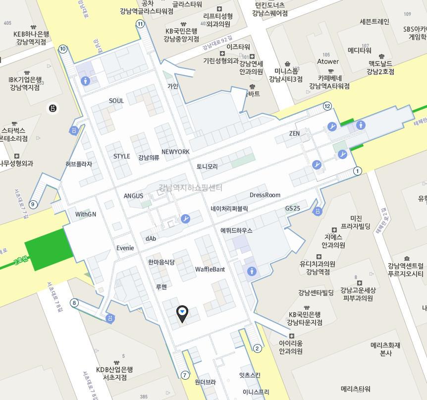 센트럴시티, 코엑스, 강남역 지하상가는 나와요. 저 단계에서 줌땡기면 가게 이름도 다 나오구요..