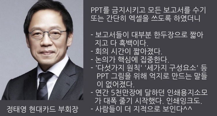 진짜 공감됩니다...ppt 구성 억지로 만드느라 핵심에 빨리 접근하질 못하고 가지치기 얘기들만 너무 빙빙 돌죠..내부회의 할땐 ppt가 뭔소용인지.. |