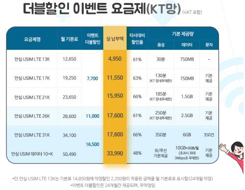무제한은 헬로모바일이 조금 더 싸니 패쓰하고 안심USIM LTE31K 가 음성 350분 문자 350개 데이터 6기가에 17600원이니 괜찮아 보입니다. 헬로모바일 처럼 24개월만 할인해 주는 거구요. 무약정이니 옮기고 싶을때 옮길수도 있구요. 다른 KT알뜰폰 계열처럼 KT할인신용카드로 할인이 되는지는 모르겠네요. 무제한 필요없는데 데이터를 좀 많이 쓰시는 분들은 괜찮을 것 같습니다.