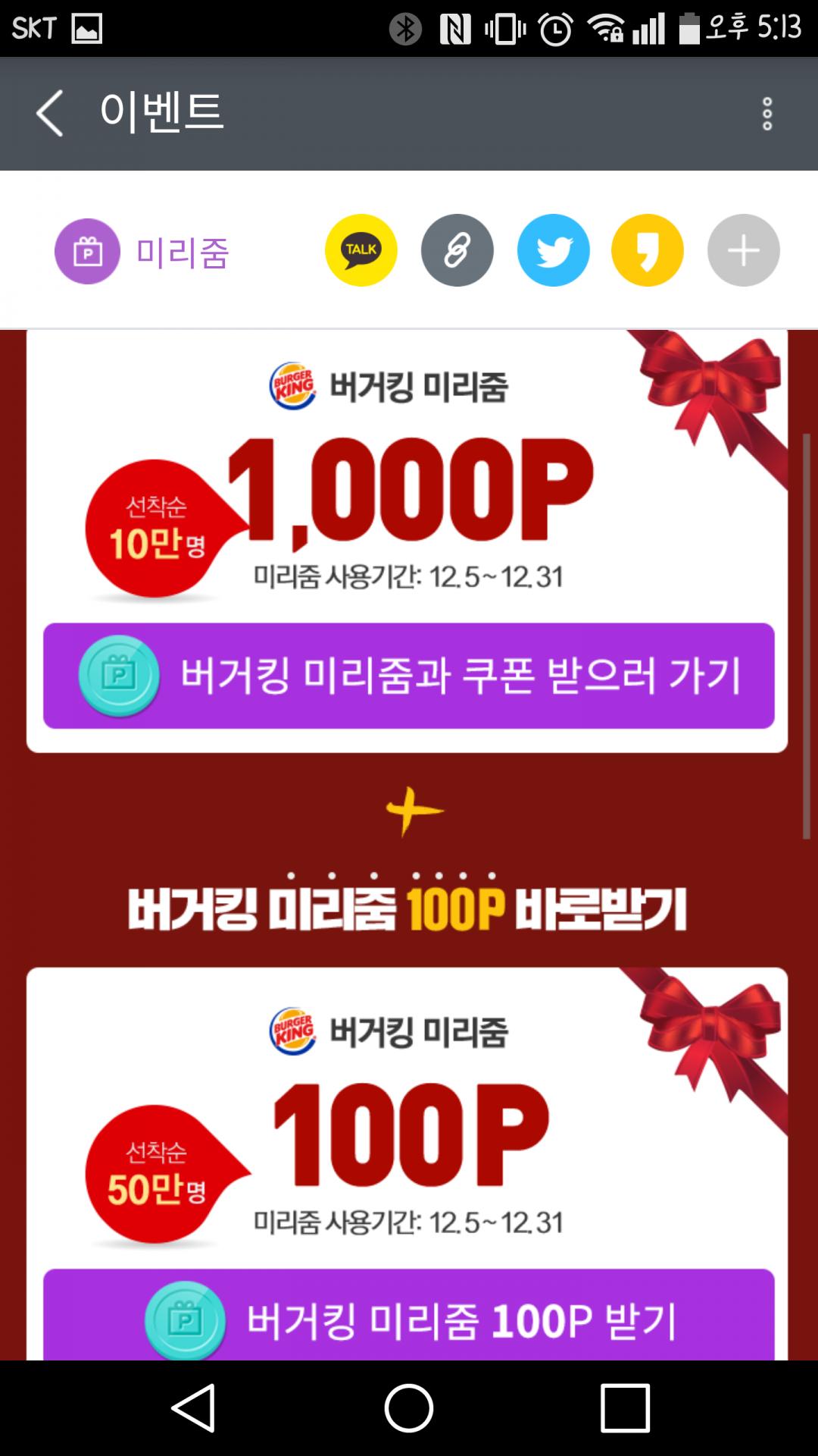 11월 사용해보니 캐쉬백 바코드 찍으면 1,100점 다 사용되는 것 같고 아무 메뉴에 사용해도 되는 것 같습니다. 전 커피 1+1 쿠폰과 불고기버거 천원짜리 먹었네요. |