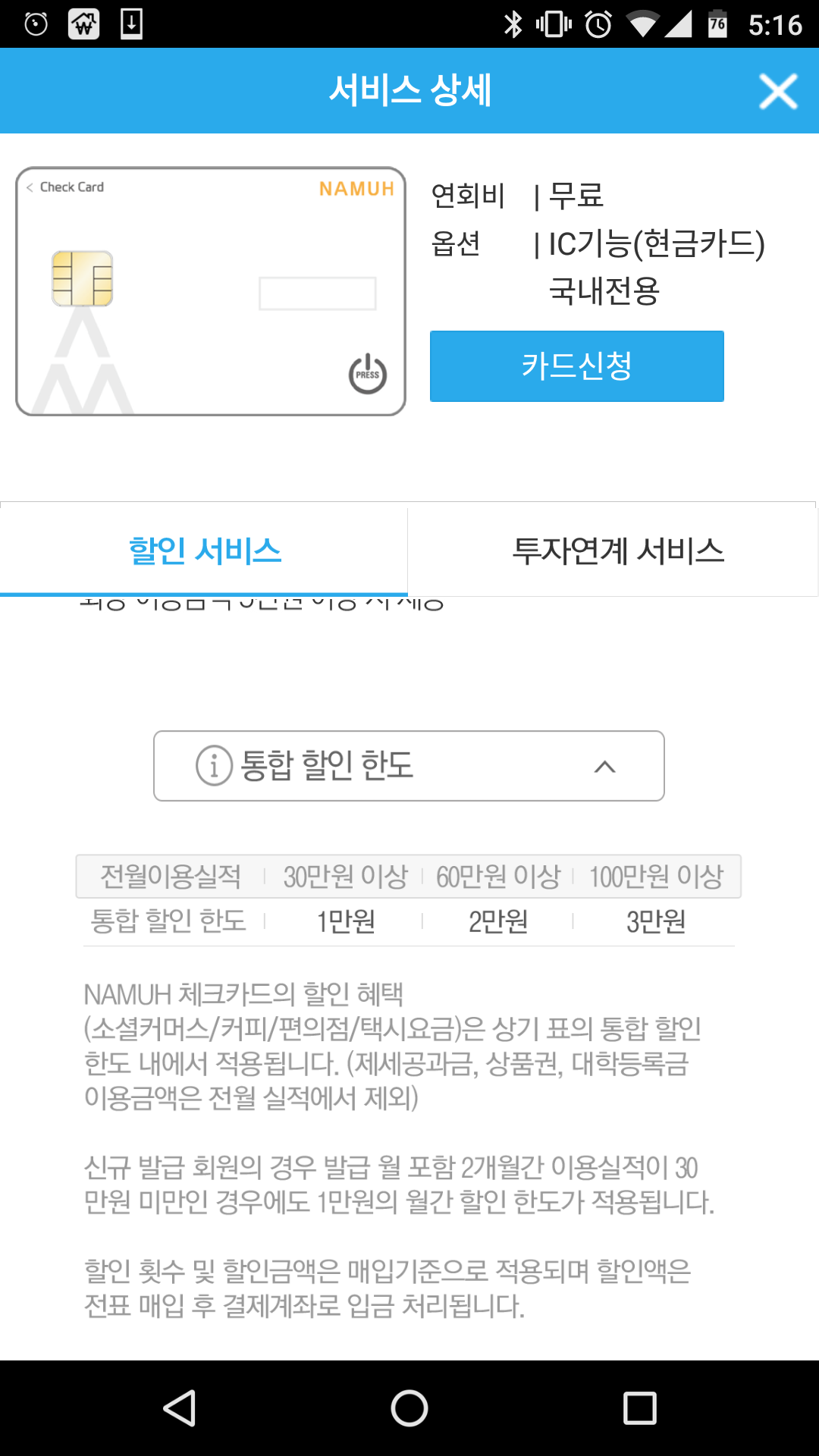 Ps> 계좌가 없으신 분들은 나무 계좌개설 어플에서 계좌를 먼저 만들면서 체크카드 신청하시면 됩니다.(다만 otp가 포함된 카드인지는 잘 모르겠네요.)