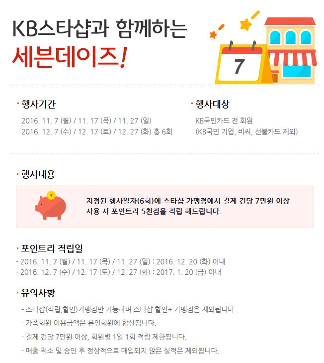 7,17,27일 국민카드로 결제시 포인트리 5천점 각각 적립됩니다.