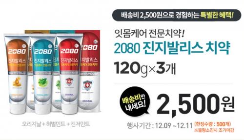 [10시오픈]  2080 진지발리스치약 120gx3개    (2,500원/무료)        선착순 500개      ~ 12/11
