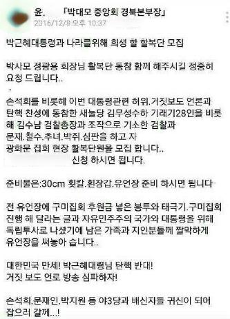 "박근혜 탄핵 광화문서 집단 할복" 박대모 할복단 모집" 기사