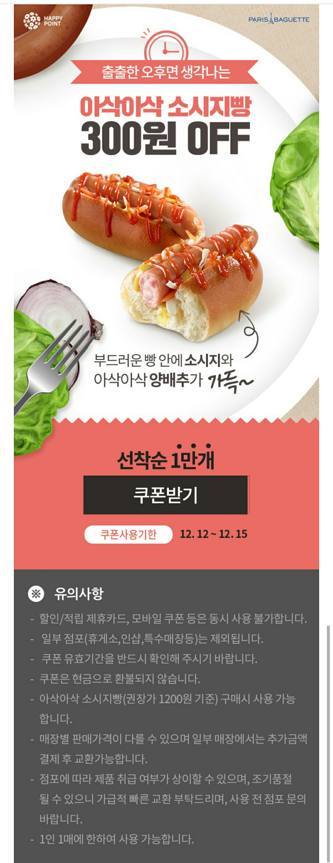 해피앱 고객만의 특별한 혜택 아삭아삭 소시지빵 300원 OFF http://apiaws.happypointcard.com/event/eventView.spc?eventseq=1407