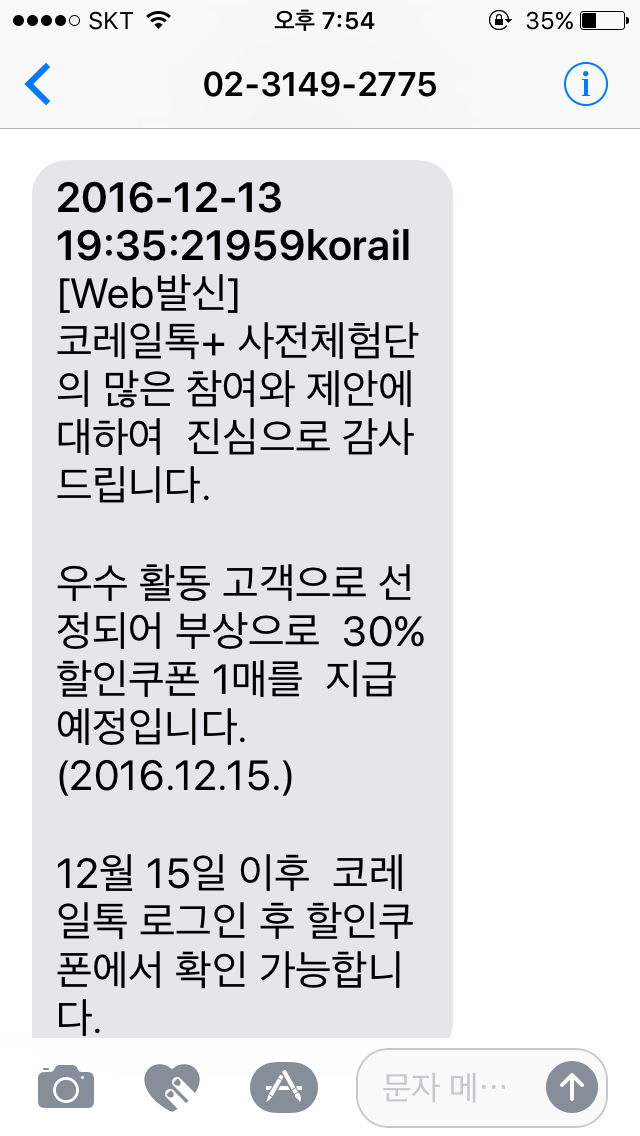 그런데 이번에는 코레일톡+ 사전 오류보고 및 건의사항 제안을 좀 보냈었는데 KTX 30% 할인쿠폰을 주네요.