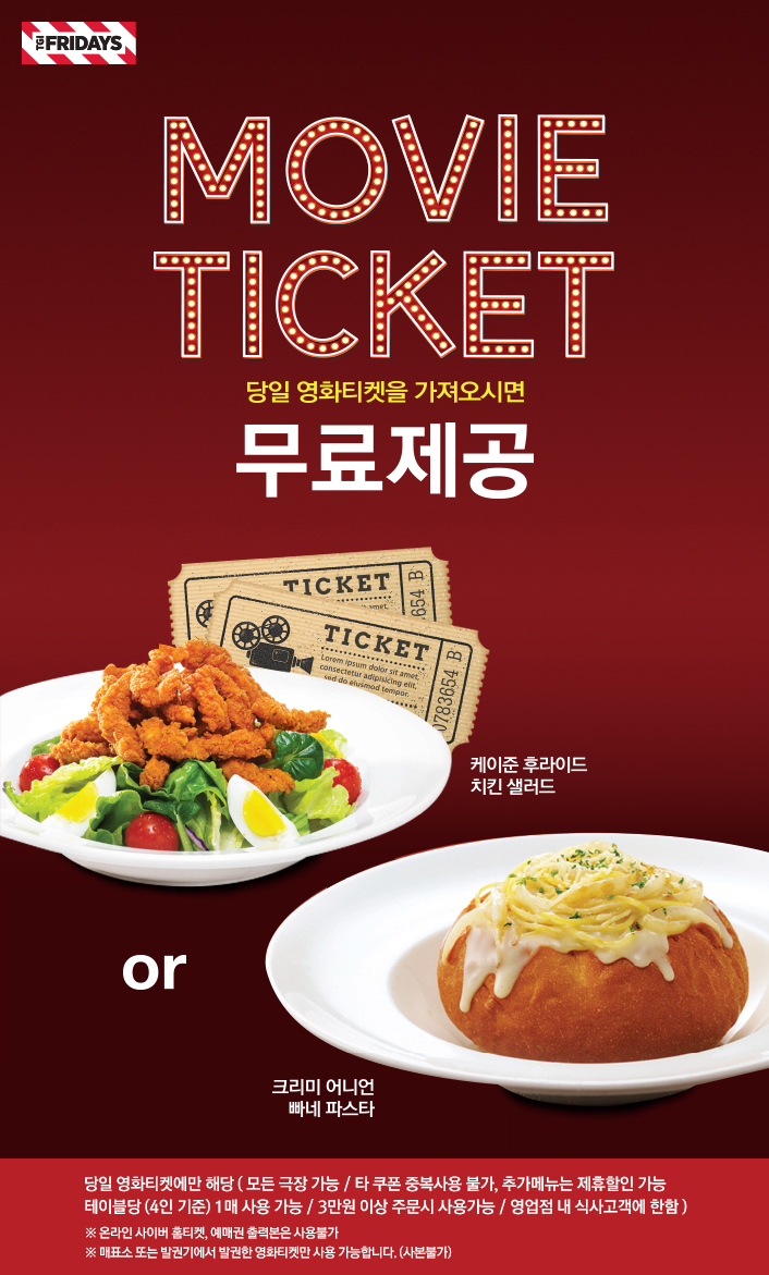 영화티켓으로 3만이상 런치메뉴 고르면 중복할인 가능합니다. 빠네파스타 무료로 먹고