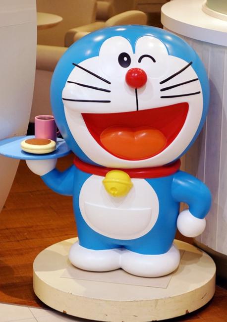 큰 도라에몽 인형과 나란히 앉아 커피를 마시고