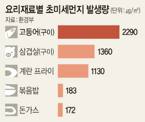 3. 음식조리때 엄청난 초미세먼지, 환기 외 별 대책 없어 → 고등어 구울 때 환경기준 ‘매우나쁨’보다 22배 발생. 삼겹살은 13배, 계란 프라이 11배...<환경부>.(문화 외) ▼(표) 재료별 발생량