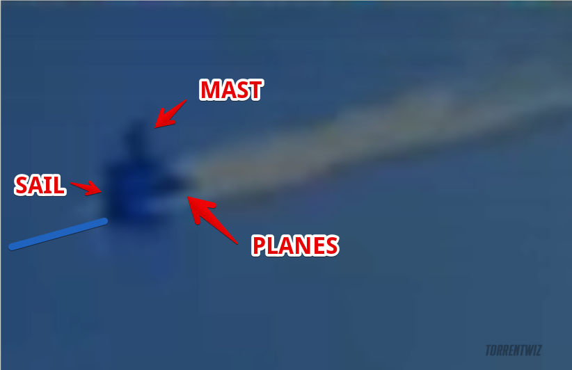 우상에서 좌하로 진행하는 무언가의 항적인 것 같습니다. 잠수함은 아닌 것 같습니다.