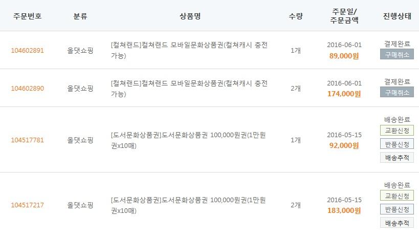 컬쳐랜드 10만원권 1장은 89,000원에 2장은 174,000원에 구매했습니다.