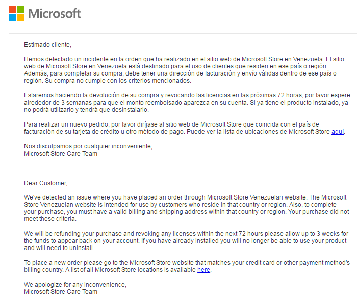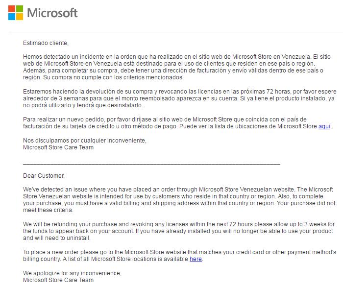 조금 전에 들어가보니 MS에서 취소메일을 보냈네요.. 어제도 하나 왔는데 그건 스페인어만 잔뜩 써놨는데 오늘꺼는 영어번역도 같이 포함시켜놨네요.. 깨알같은 고객 서비스의 일환일까요?