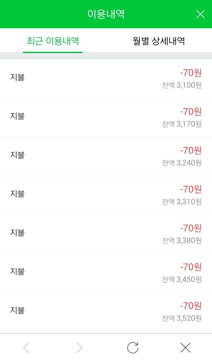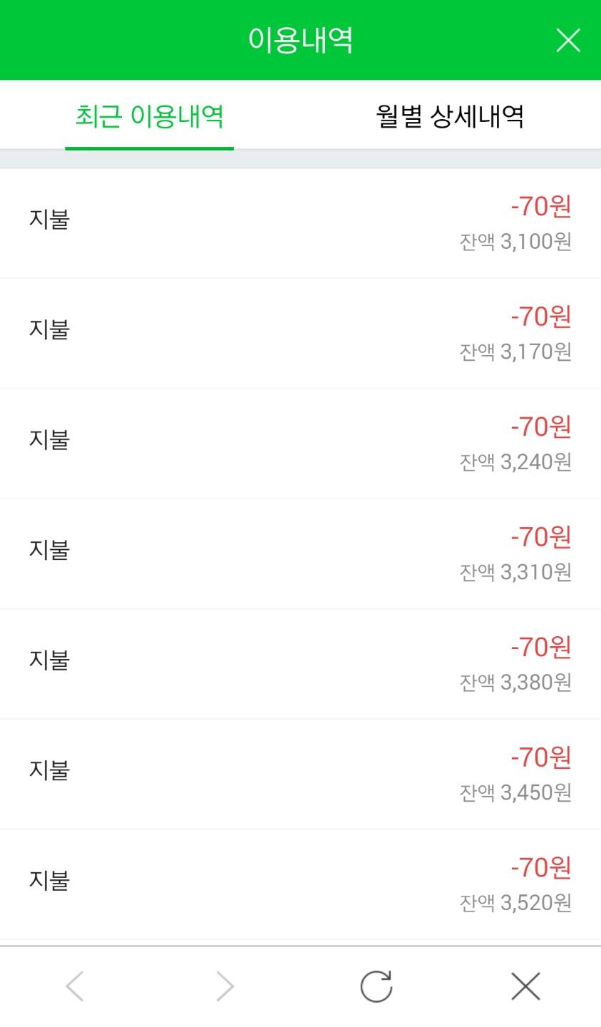 70원씩 70번 = 4900원 / 8천원 충전 = 3100원 잔액 두번 남겨왔습니다.