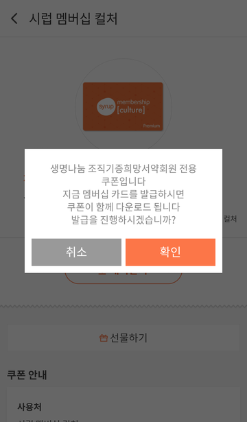시럽 앱에서 컬쳐 멤버쉽으로 검색하면 나오는 쿠폰 중에