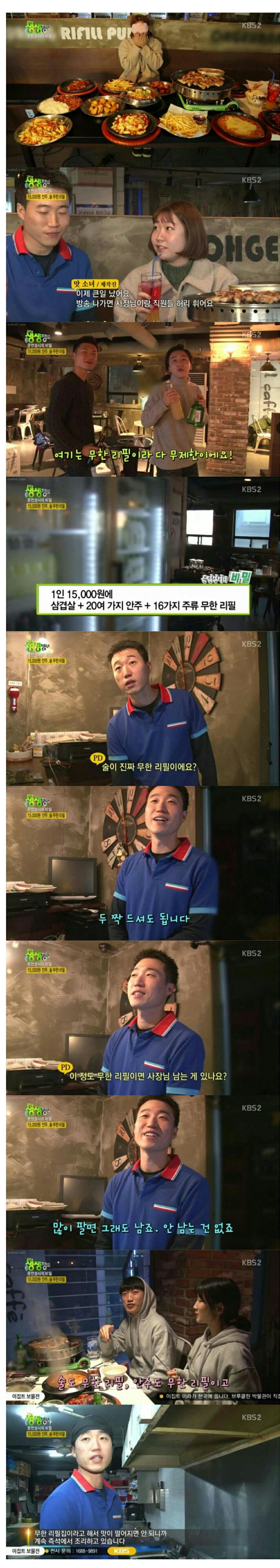 예전에 한번 평택에 있는 무한리필집 가본적있는데, 무한리필도 맞았고, 단지 반찬수가 방송보다 조금 적었으나, 비슷하게나왔는데, 가장 중요한건 일 50테이블인가 50명인가만 팔았었습니다. 그래서 가서 허탕친경험이있습니다.