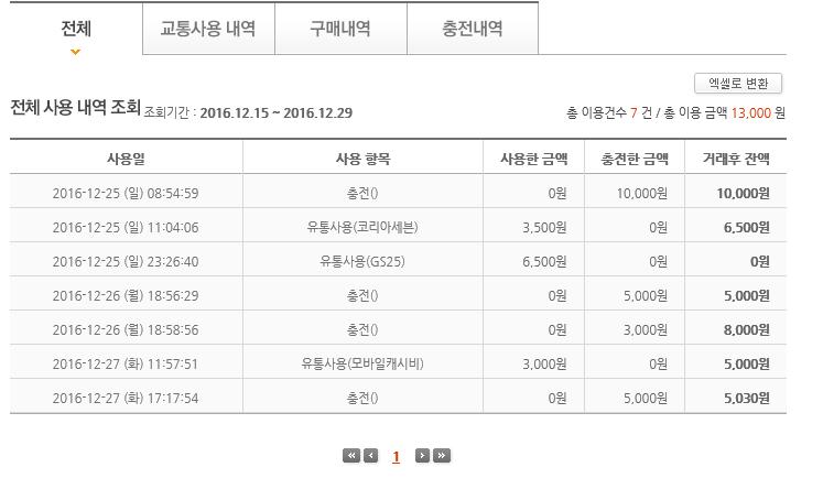 25일, 26일, 27일 다른 사용건 (충전+대중교통사용)은 전부 뜨는데